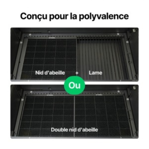 Fabriqué en aluminium ultra-léger et résistant à la corrosion, ce panneau offre une surface de travail stable tout en facilitant l’évacuation de la fumée et des résidus pendant la découpe. Les matériaux sont légèrement surélevés, ce qui améliore la qualité de coupe et protège la surface de travail.