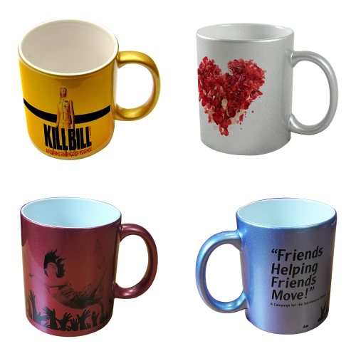 Les Mugs Glitters possèdent un revêtement pailleté qui donne leur donne un effet métallique. Ils sont traités polyester, ils conviennent donc aux marquages en sublimation. Comme leurs couleurs sont assez foncées pensez à des marquages en nuances de gris et noir mais aussi au TRANSFERT LASER !